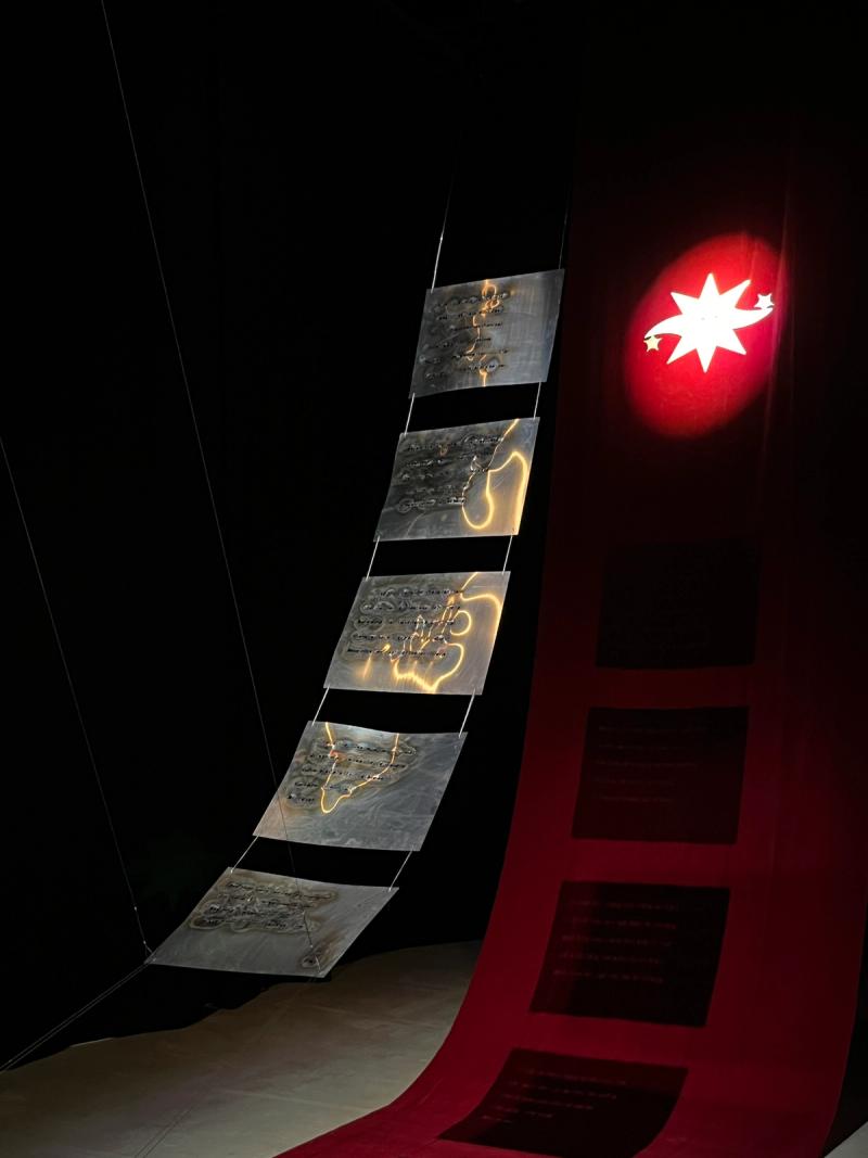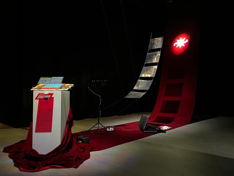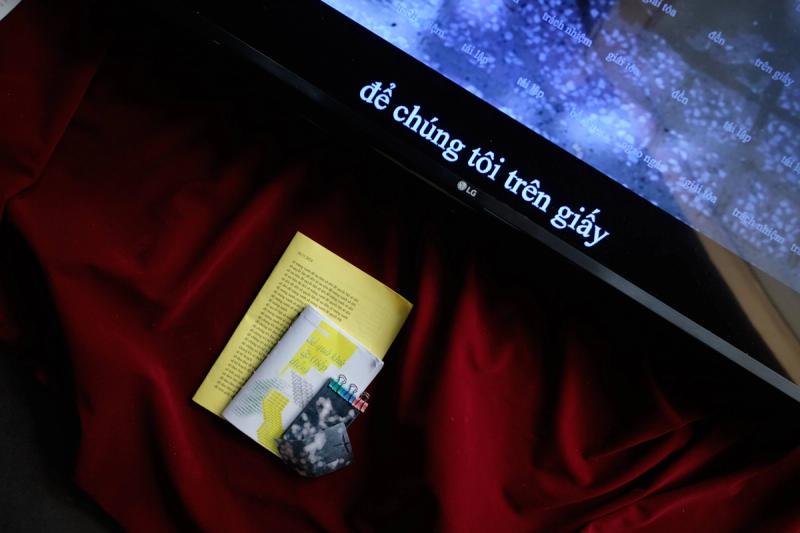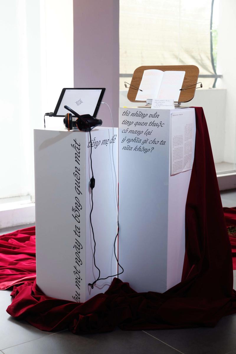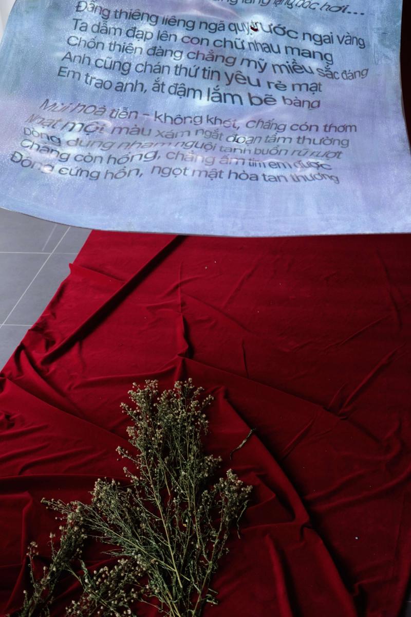 Đông-Trúc decided that the Mường language, the kinest cousin of modern Vietnamese that had been her childhood neighbor, to be the treatment for this discourse. The artist created a space for audiences to immerse themselves in the auditory qualities of rhyme and tone, exploring the possibility of shared resonances within the Vietnamese linguistic landscape.
