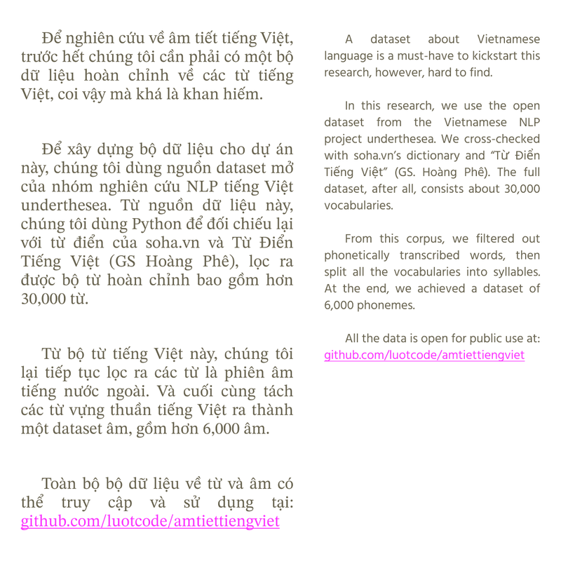 From that point, we delved into the syllables of Vietnamese. Upon the Vietnamese dictionary of Hoàng Phê, soha dictionary, and current NLP research of underthesea, we built a dataset of mono syllables of Vietnamese. While developing that, we published our observation in the format of 3 essays. This laid the foundation for our project and for Dmarc Lê, Đông-Trúc, and thou to extend their artistry into the poetic computation of Vietnamese.