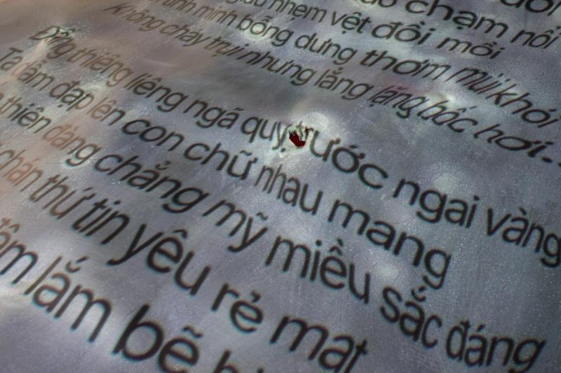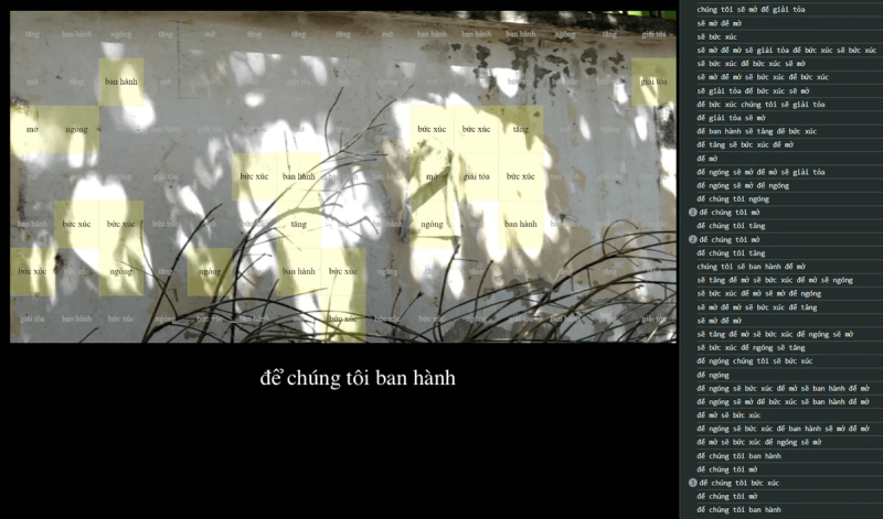 Drawing from over 50 news articles about Metro Line No. 2, the artist selects 49 key words and phrases, constructing a lexicon of the trees. These words are inserted into a repetitive syntax—"để...sẽ...để...sẽ..." (to…[we] will…to…will) —that loops endlessly, pushing language to its breaking point, where meaning dissolves into oblivion and promises become empty shells.