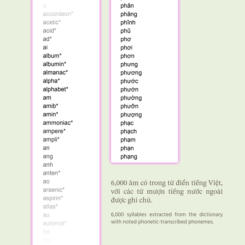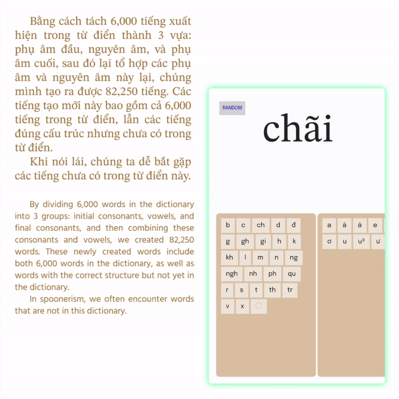 To understand the mechanics of syllable formation, we broke all the syllables down into these three core phonetic components. Then, algorithmically recombining these elements, we generated a dataset of 82,000 possible syllables, including both the 6,000 commonly used ones and 76,000 novel (for examples: "boéch", "gập", ... ) yet phonetically plausible syllables. These "unfamiliar" forms invite a renewed awareness of Vietnamese phonology.