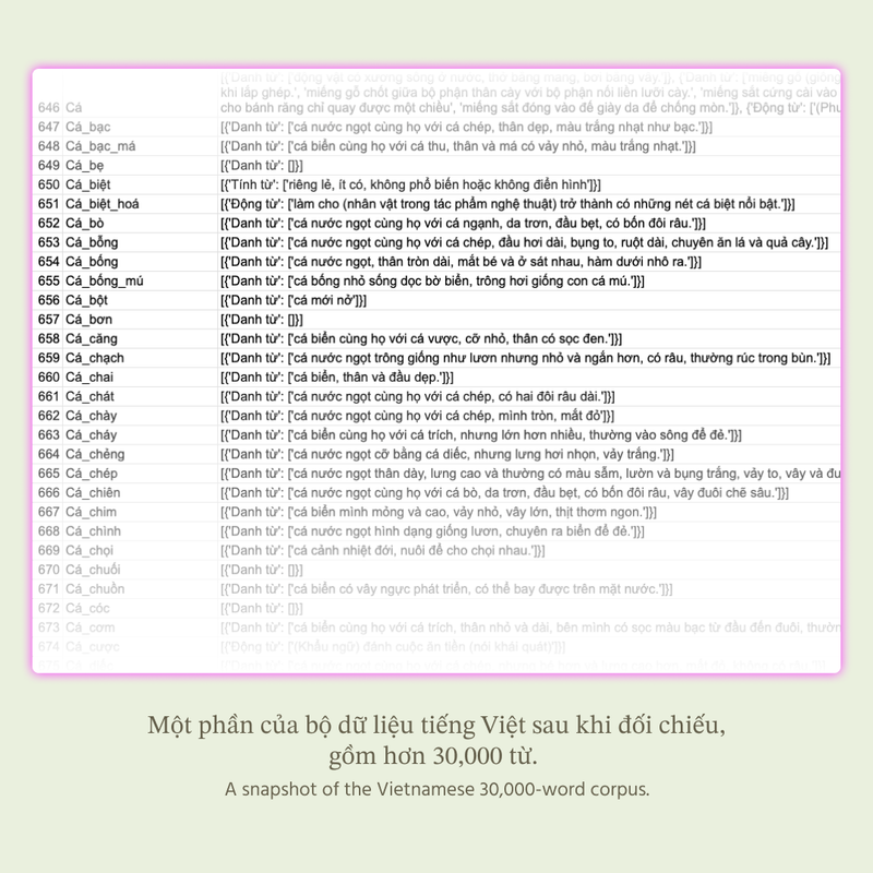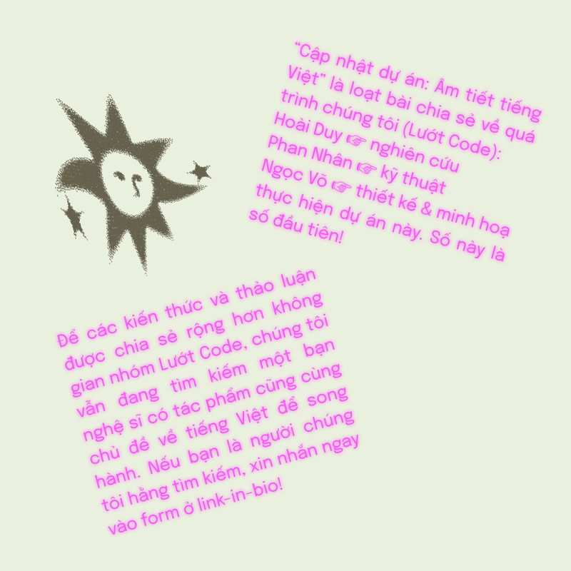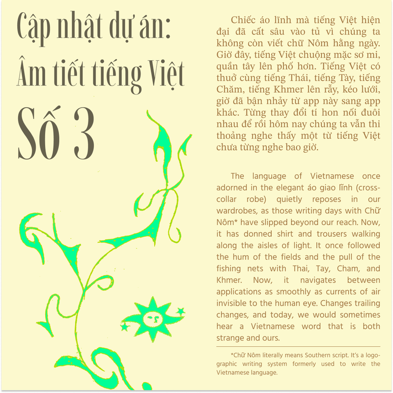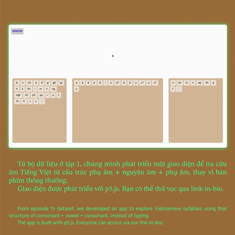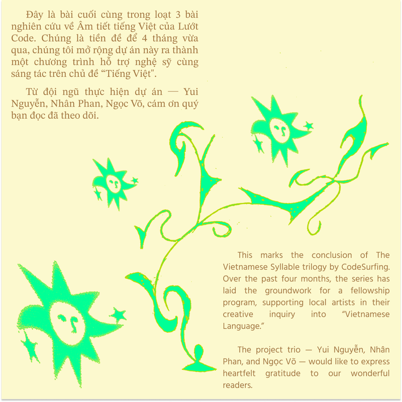 With the open dataset of 82,000 syllables, in June 2024, CodeSurfing introduced Our Vietnamese Project to the community, calling for collaborations with local artists and language enthusiasts. By combining linguistic research with artistic experimentation, the fellowship expects to continue the ongoing research, which is centered around Vietanamese's monosyllables while opening up new, imaginative ways of engaging with the language.