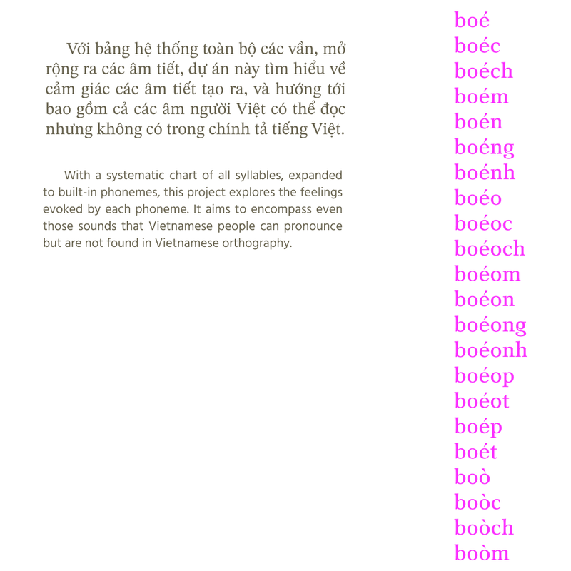 On that poetic observation about the Vietnamese syllables, the project started with a series of 3 researches, inquiring on the monosyllabism of Vietnamese. From this research trilogy, an attempt is made to redesign the Vietnamese keyboard, structuring it by syllables rather than individual letters.