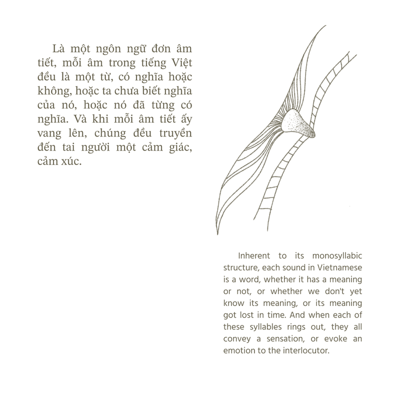 “Bên Kia Của Vần” (loosely translated: The Other Side of Syllables) investigates the co-dependence of meaning and sound in language. Typically, we engage with rhyme from the vantage point of meaning, interpreting words through the concepts they convey. But what happens if we shift our gaze to the other side—where sound, liberated from the necessity to hold designated meaning, holds expressive power?