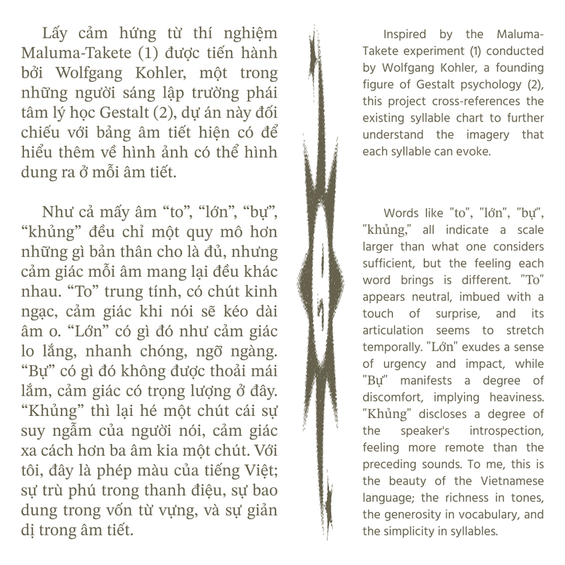 Upon this inspiration of poetic computation, we navigated our research into the poetic aspect of Vietnamese — how our language invokes its flexibility and intimacy. All cues lead to its syllables. Unlike English, Vietnamese is a monosyllable language. Every syllable in Vietnamese, when pronounced, invokes a certain feeling, a certain image. “đau”, “đớn” cut deep it bleeds. “trùng”, “điệp” embark on a great odyssey. That poetic must have come from our syllables.