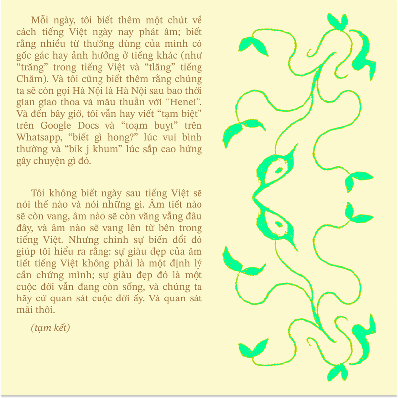 The Vietnamese language was born in the dense, misty forests that can disguise the Karst. From there, the language carried its Beloveds to the first capital and, with it, the expansion of the state. From the forest deep inland, the Vietnamese are now contemplating the vast ocean from endless sand dunes, turning the dangers in the grooves into cuisine and culture and blanketing the chilly imposing mountain ranges. Vietnamese has been going so far from its cradle. Today, Vietnamese is the star of the Austroasiatic linguistic family; it is the official language of a country that holds the sense of belonging of more than 100 million people. Changes did not just stay on maps, but also platforms. From inscribing on turtle shells and bones to marking time with stone, writing letters on paper, recording sounds, making phone calls, sending text messages, and posting status updates across the Internet. At this very moment, as we witness countless traditions either being granted wings to soar or absorbed into the modernity of the times, the Vietnamese language has long been present, quietly evolving and adapting, already there before we even noticed.