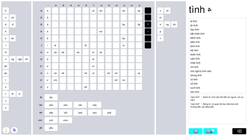 These newly discovered syllables are documented at our Github, together with its open source code. To help expand the project, we created a new Vietnamese keyboard ⎯ one that based upon the syllabic components of Vietnamese, rather than the normal QWERTY keyboard that centered around the alphabet.