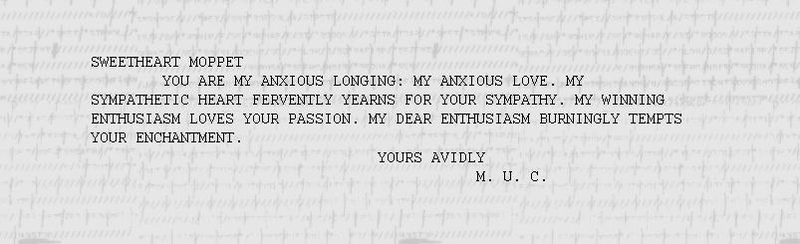 “Each letter follows a similar structure, and is full of melodramatic Victorian overtones, with pet names like "honey," "jewel," and "moppet" along with other saccharine and yearnful descriptives. The letters were constructed via a generative algorithm that produced a variety of orders and combinations.”
