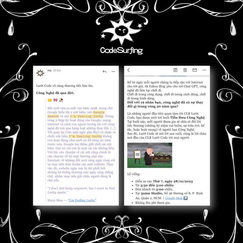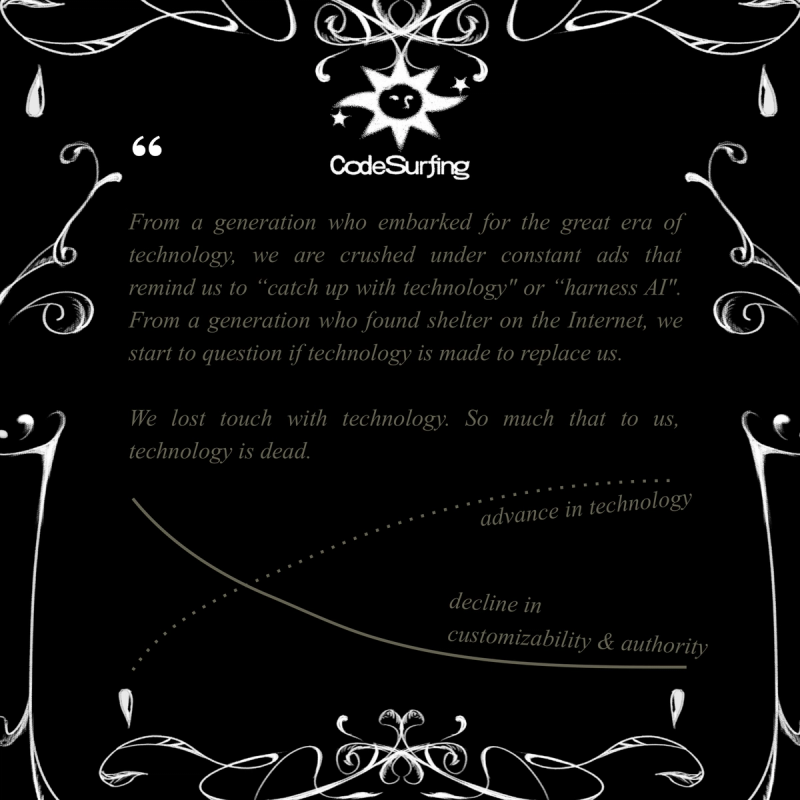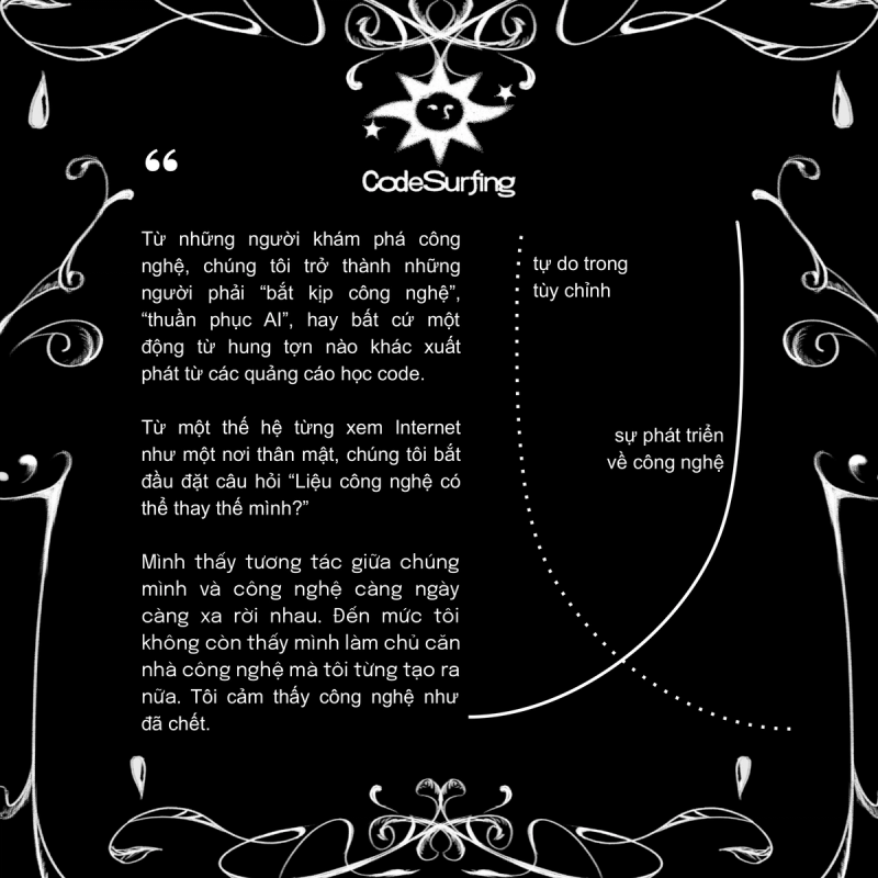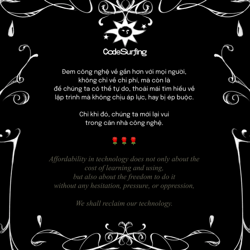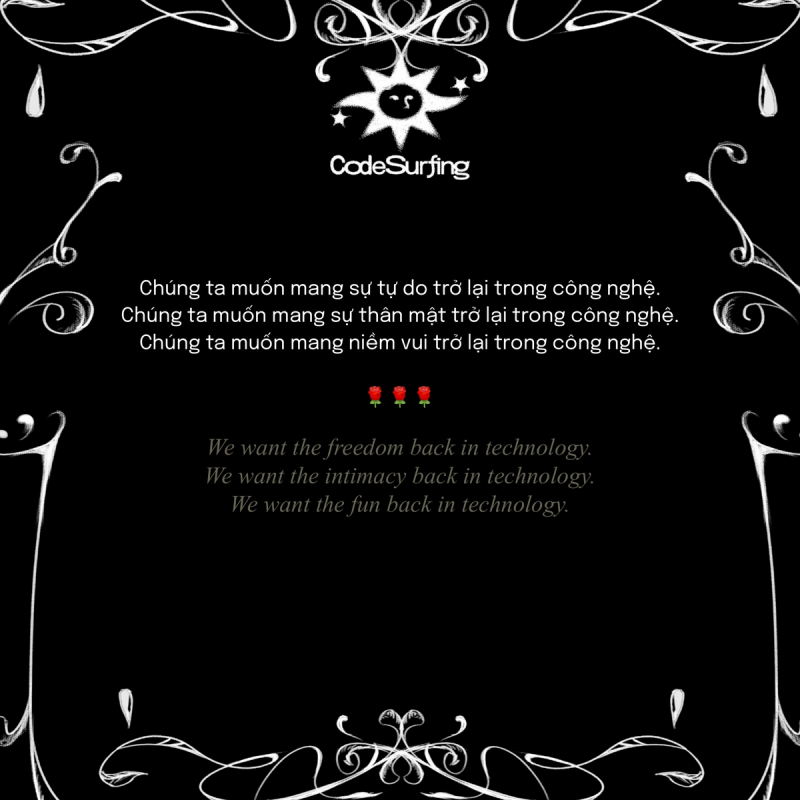Chúng mình tiếp cận với máy móc, lập trình, và cõi mạng một cách thân mật, hồn nhiên, và ý nghĩa — để người sáng tác về lại với bản thể và để công nghệ về lại với sự tươi vui. Ngoài ra, Lướt Code xem công nghệ không chỉ bao gồm các trào lưu gần đây, mà còn bao gồm các công cụ, kỹ thuật đã và đang tồn tại trong đời sống người Việt Nam. Làm sao để chúng ta có thể kết nối và phát huy những giá trị sẵn có đó là câu hỏi mà Lướt Code hướng tới.